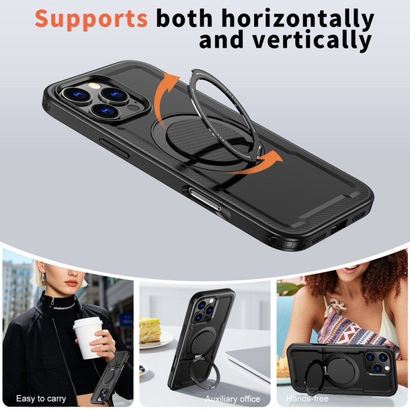 Bescherm je iPhone in stijl met deze innovatieve MagSafe-compatibele hoes. Met een 360° roterende kickstand biedt hij betere bescherming terwijl handsfree kijken eenvoudig wordt. Duurzame hybride constructie en nauwkeurige openingen voor optimale toegang.