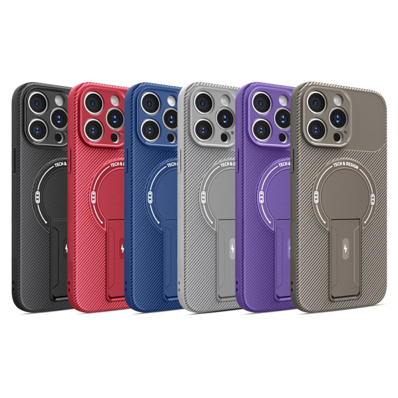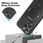 Robuuste bescherming voor iPhone 13 Pro Max met koolstofvezeltextuur en geïntegreerde standaard. Slagvast hybride ontwerp biedt bescherming op militaire schaal, antikrascoating en compatibel met magnetische autohouder.
