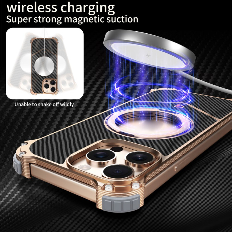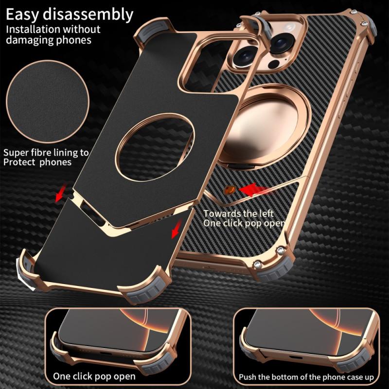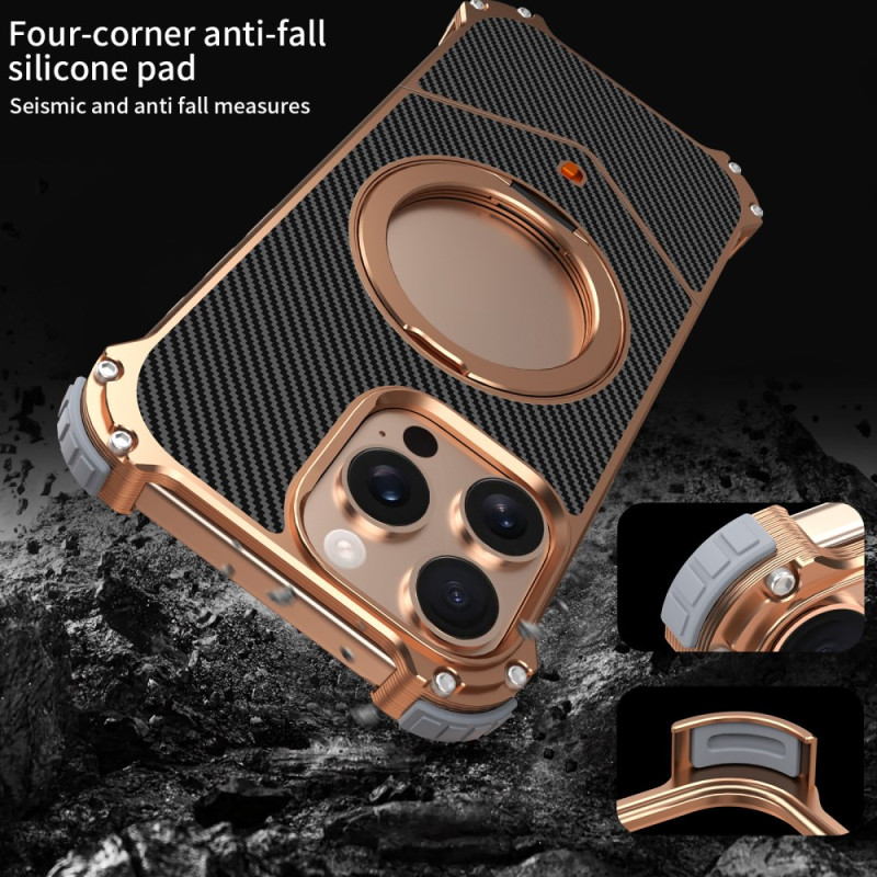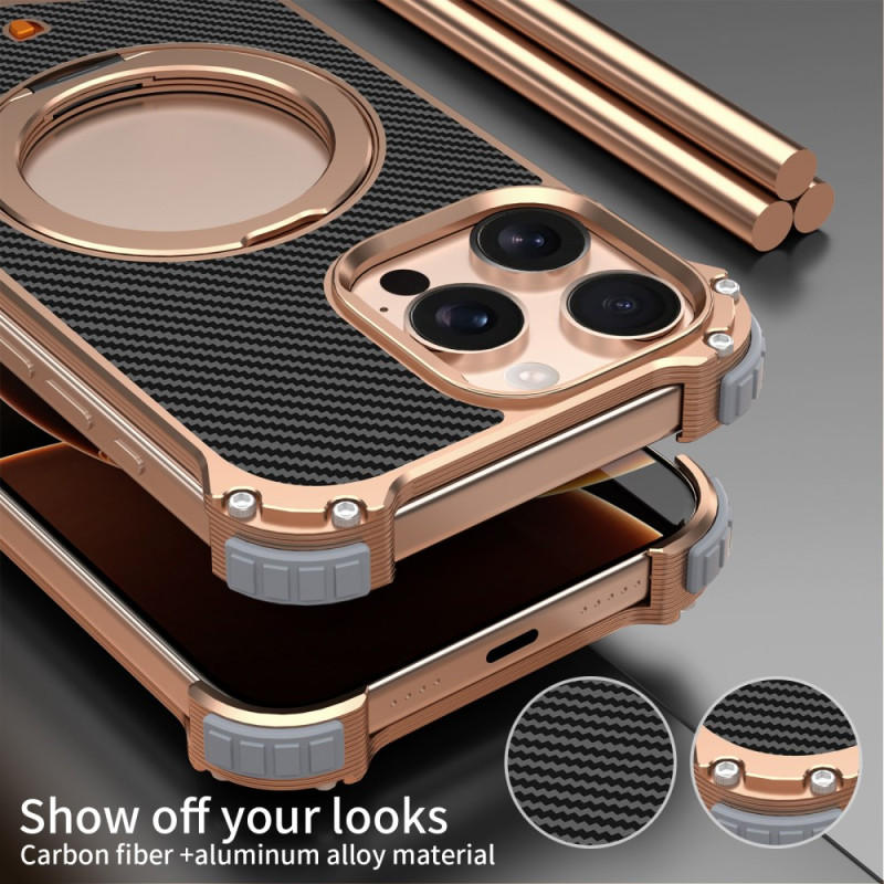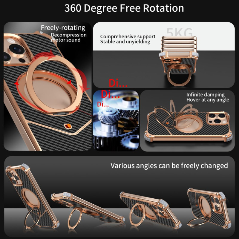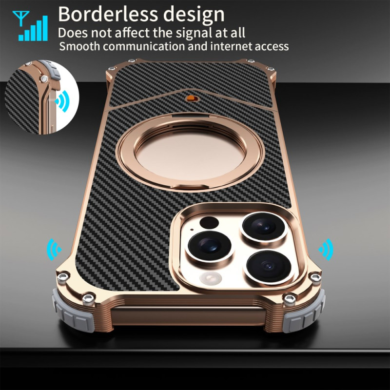 Bescherm je iPhone 13 Pro Max in stijl met deze magnetische hoes zonder randen. Verfijnde koolstofvezeltextuur, 360° draaibare kickstand en versterkte hoekbescherming met antischok luchtkussentjes. MagSafe-compatibel voor optimaal draadloos opladen.