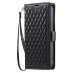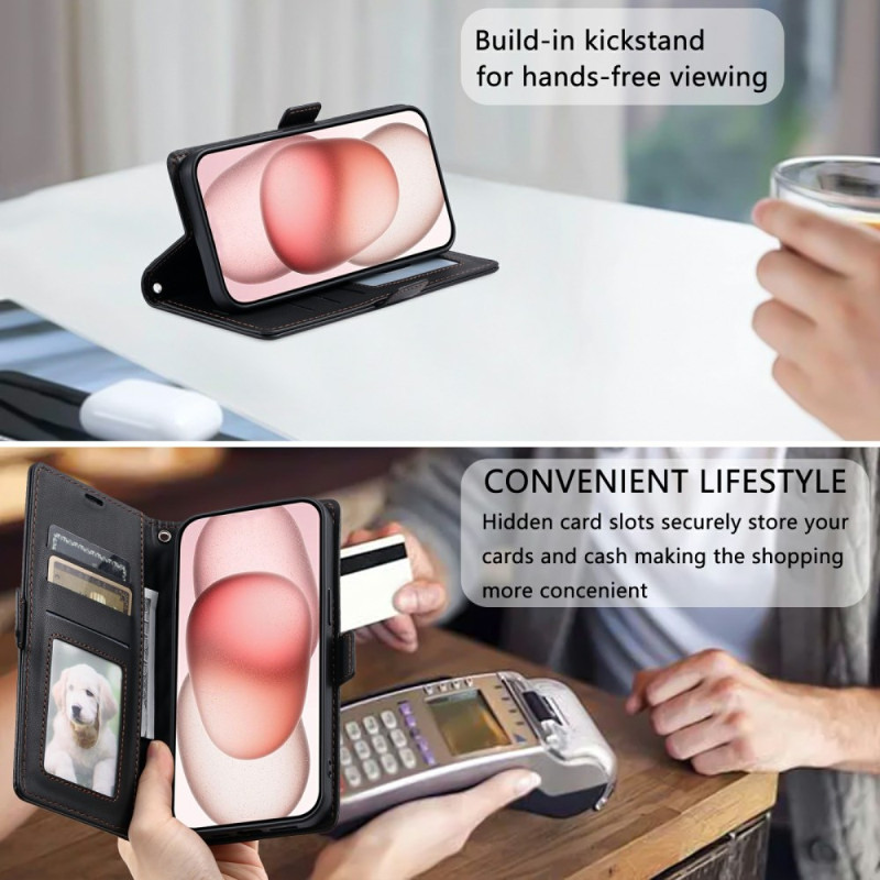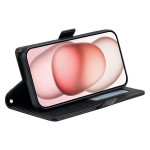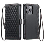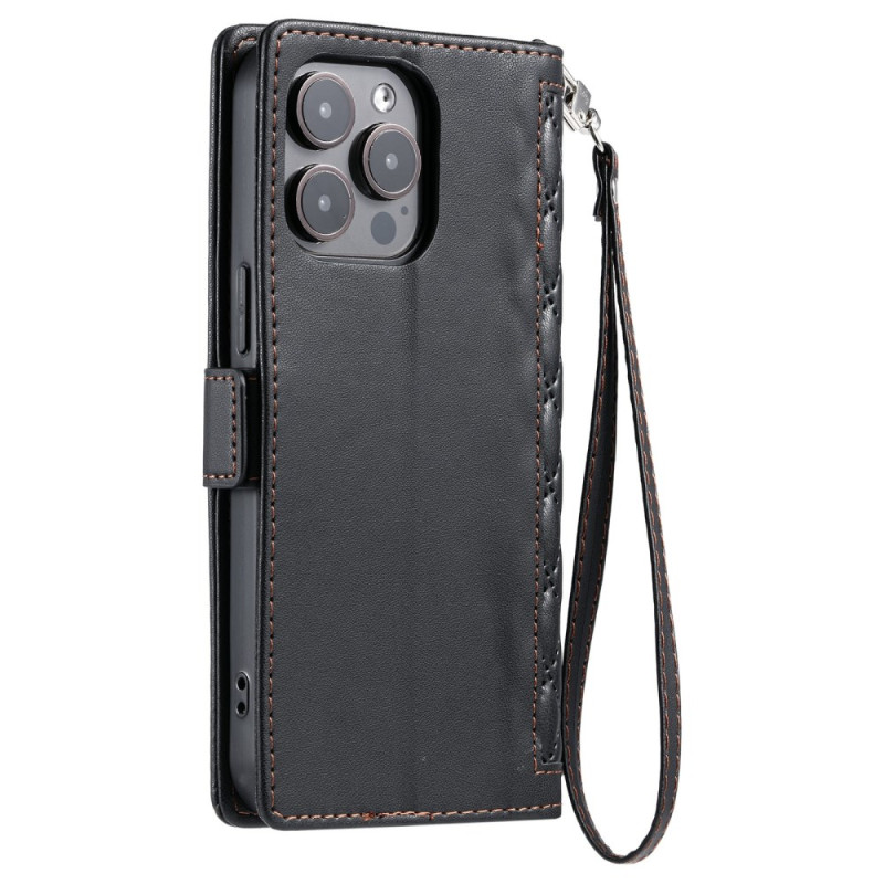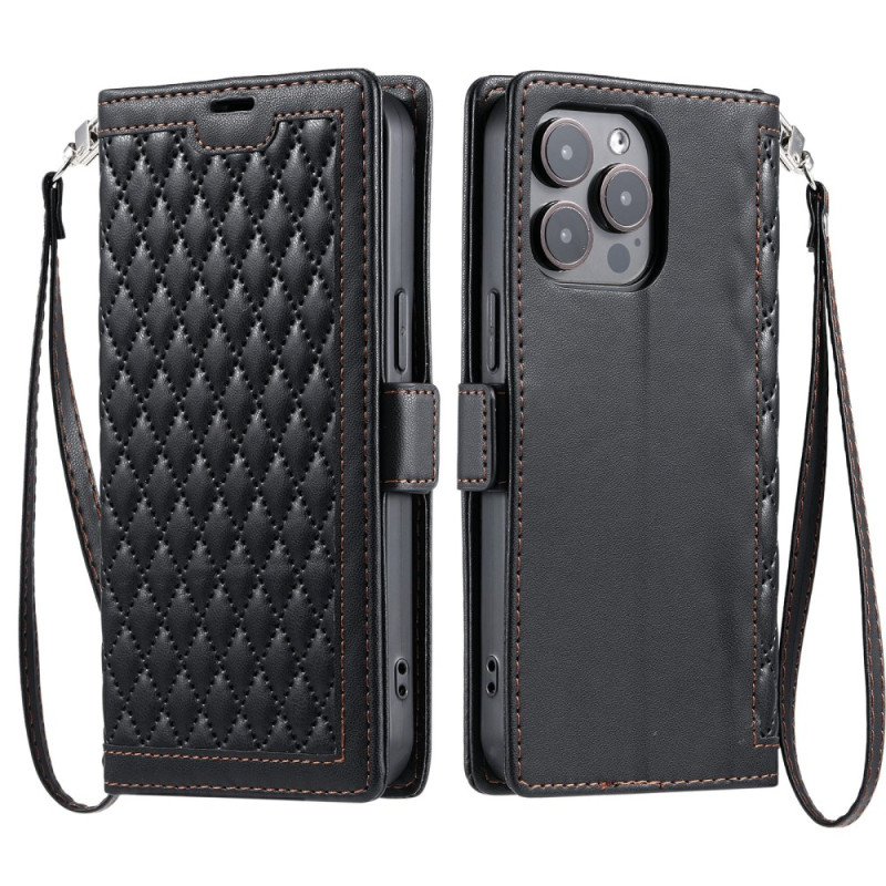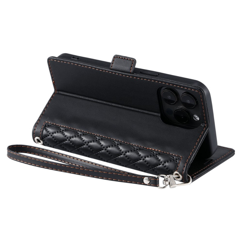 Elegant portemonnee hoesje voor iPhone 13 Pro Max met verfijnd ruitpatroon. Met 3 kaartsleuven, 1 geldvakje en een praktische handriem. Verandert in een handsfree houder om je inhoud comfortabel te bekijken.