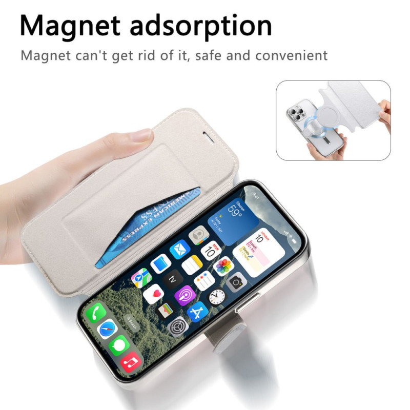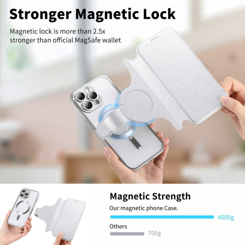 Bescherm je iPhone 13 Pro Max in stijl met deze MagSafe-compatibele premium PU-leren hoes. Met een verstelbare standaard, geïntegreerde kaarthouders en RFID-technologie combineert hij stijl en functionaliteit voor volledige bescherming.