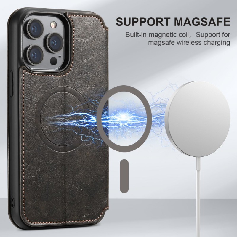 Elegante portemonneehoes van eersteklas PU-leer voor iPhone 13 Pro Max, compatibel met MagSafe. Magnetisch ontwerp met 3 kaartsleuven, geïntegreerde standaardfunctie en versterkte camerabescherming. Combineer stijl en functionaliteit voor dagelijks gebruik.