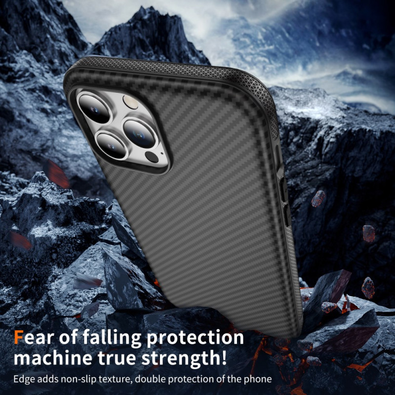 Bescherm je iPhone 13 Pro in stijl met deze eersteklas hoes met koolstofvezeltextuur. Hij is compatibel met MagSafe en biedt een comfortabele, stevige grip terwijl hij optimale bescherming biedt tegen stoten en krassen.