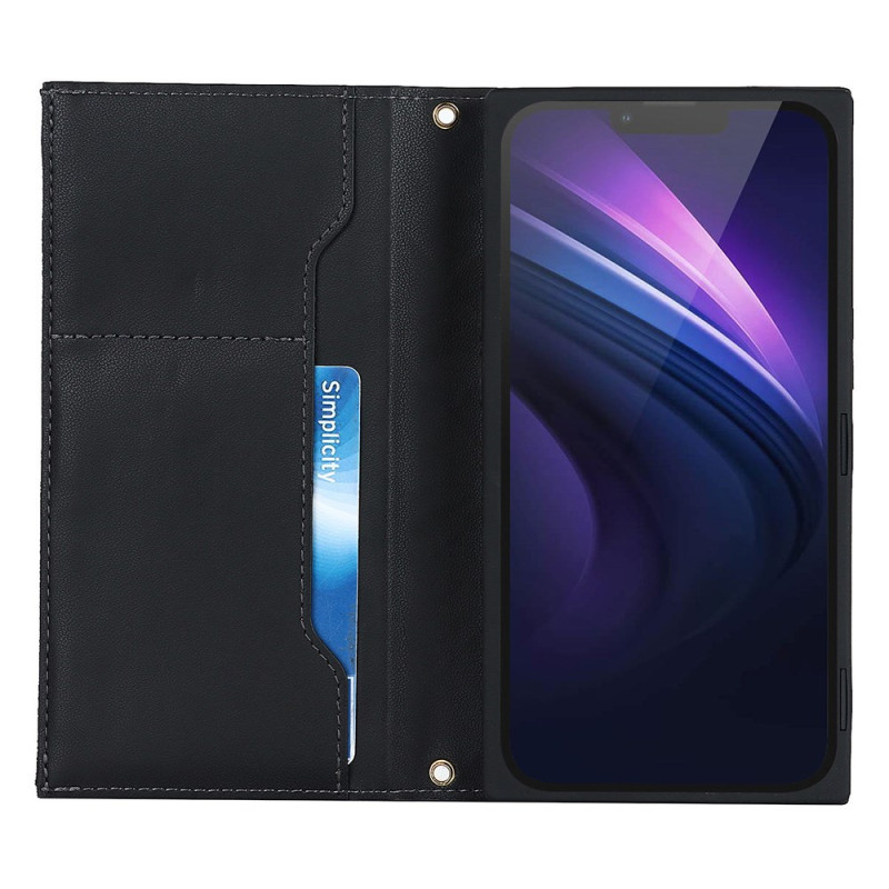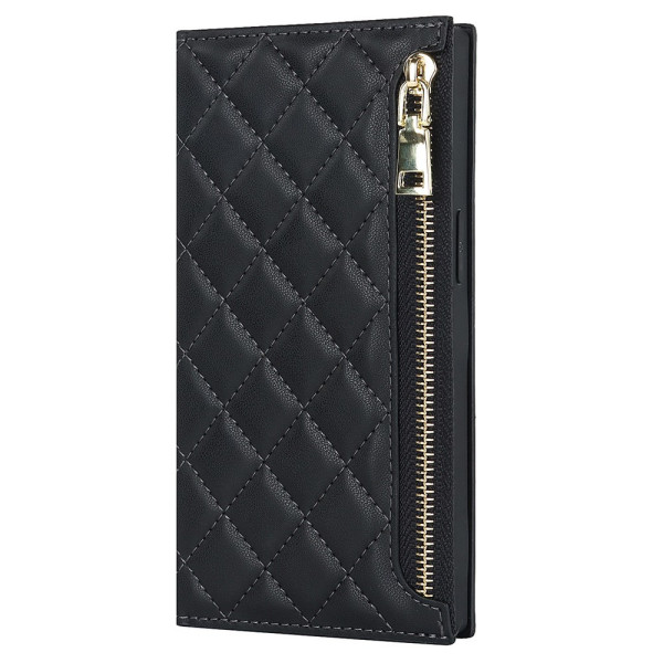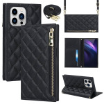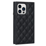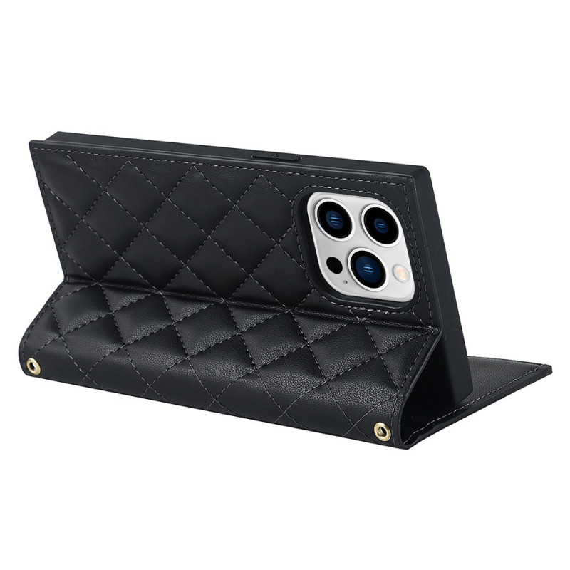 Étui portefeuille élégant en cuir PU avec texture losange pour iPhone 13 Pro. Doté de multiples emplacements pour cartes, une poche zippée, une fermeture magnétique et une bandoulière amovible. Support mains libres intégré pour un confort optimal.