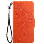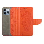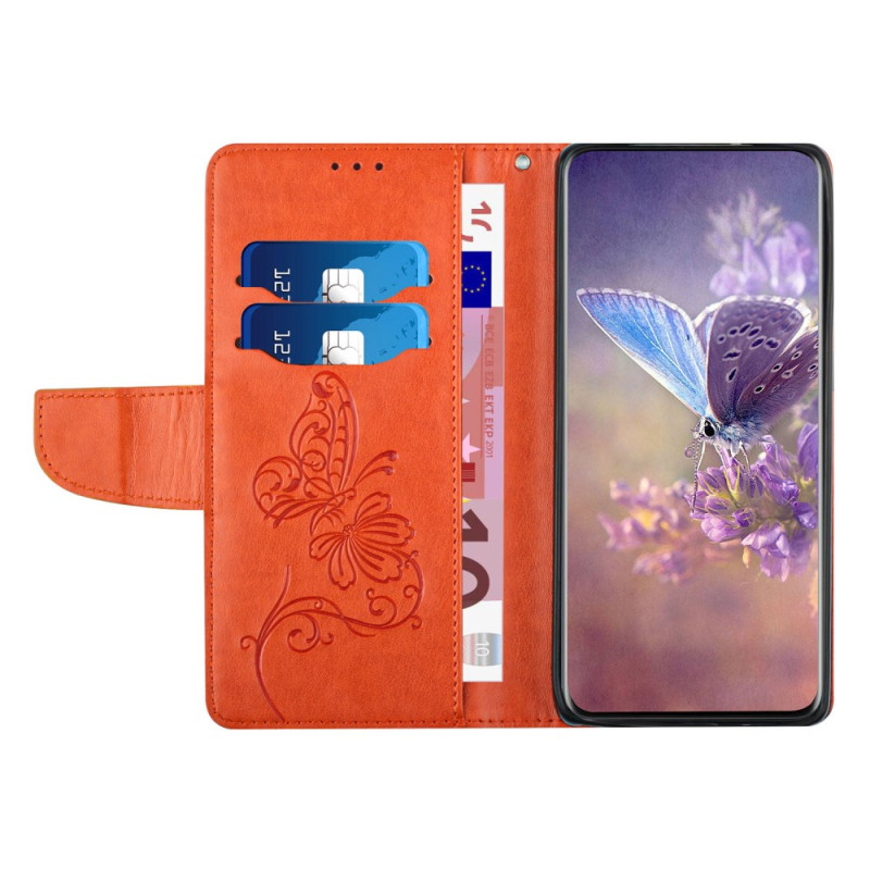 Elegant etui met gegraveerd vlinder- en bloemmotief. Dubbele bescherming met magnetische flap. Inclusief 2 kaartsleuven, 1 geldvak, geïntegreerde houder en praktische handriem voor veilig transport.