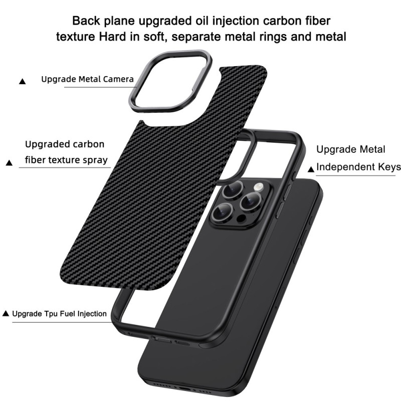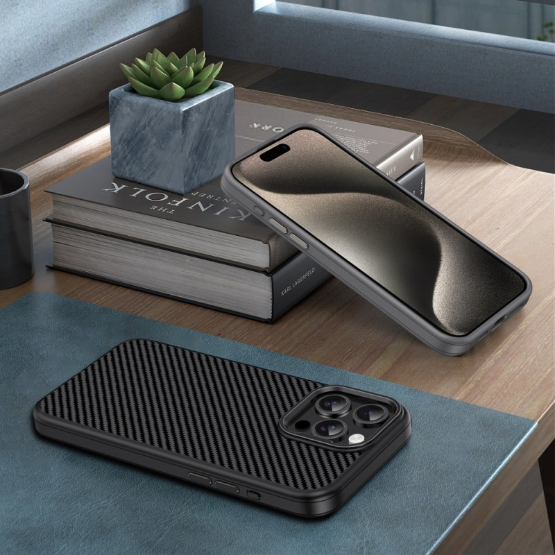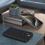 Ontdek de IPAKY case voor iPhone 15 Plus, die stijl en bescherming combineert. Hij is gemaakt van hoogwaardig TPU met een stijlvolle koolstofvezeltextuur en biedt uitzonderlijke duurzaamheid en verbeterde grip. Het metalen frame rond de lens en de onafhankelijke metalen knoppen bieden extra bescherming en nauwkeurig tactiel gebruik.
