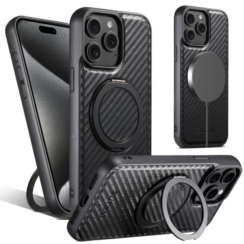 Ontdek onze revolutionaire hoes voor iPhone 15 Pro Max. Met een 360° roterende standaard, MagSafe-compatibiliteit en een stijlvolle carbon textuur biedt hij volledige bescherming en een verfijnde stijl. Geniet van handsfree kijken en eenvoudige toegang tot alle functies van je apparaat.