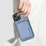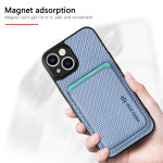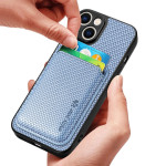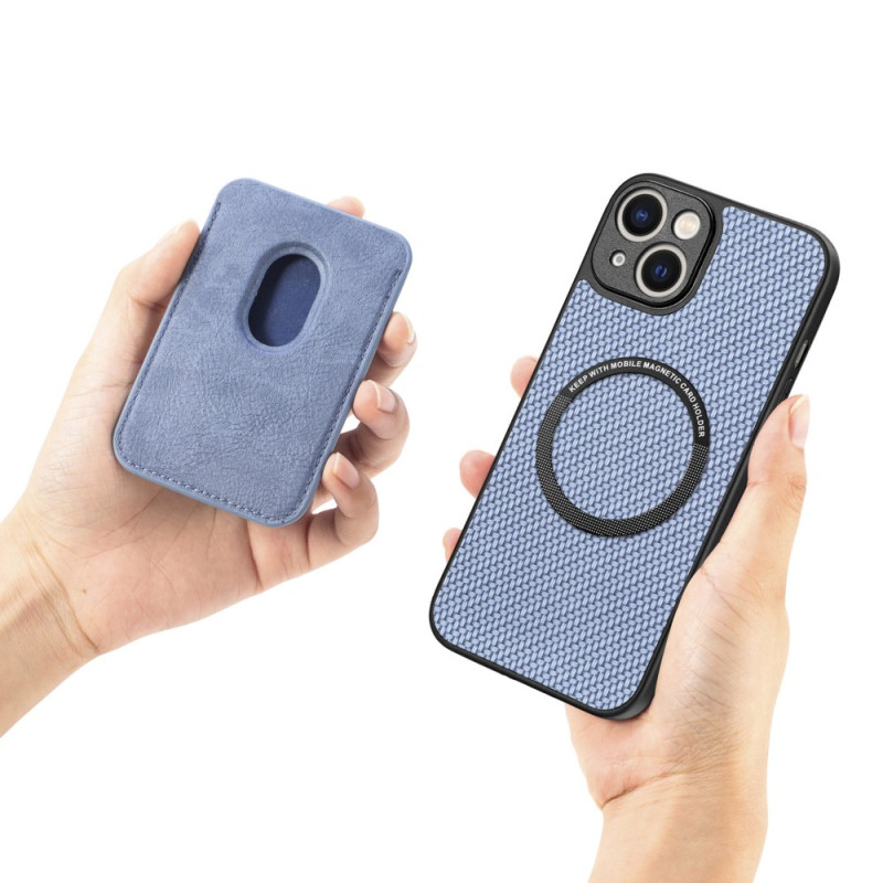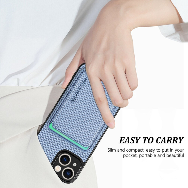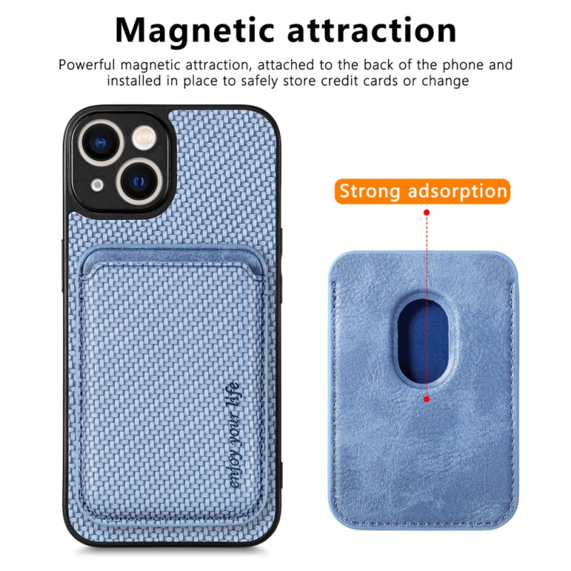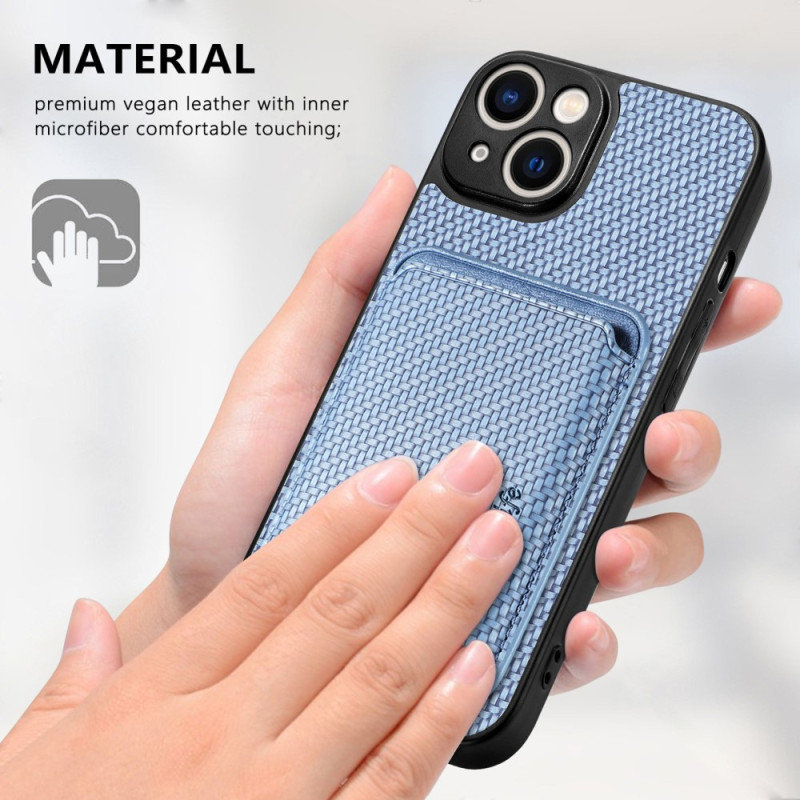 Je iPhone 15 is prachtig beschermd in deze koolstofvezel hoes met afneembare kaarthouder.