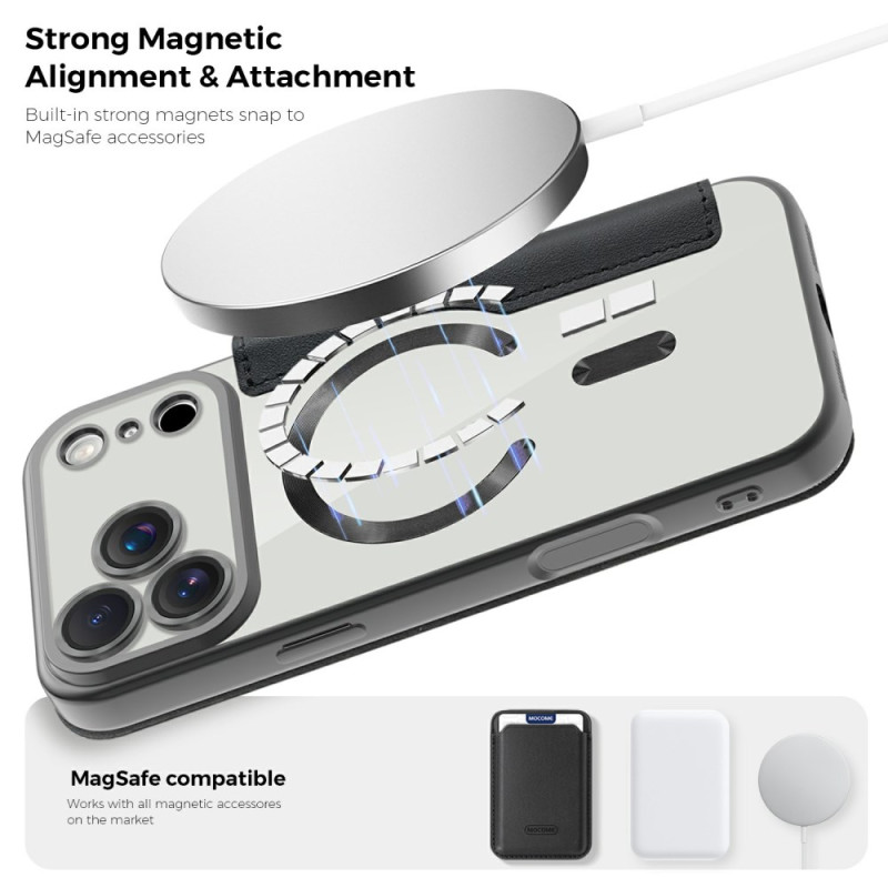 Met zijn elegante, moderne styling combineert deze case voor iPhone 17 Pro PU-leer met diamantstructuur en slijtvast TPU voor duurzame, stijlvolle bescherming. MagSafe-compatibel met geïntegreerde magneten met cd-adertechnologie voor snel en stabiel draadloos opladen. Het transparante achterpaneel benadrukt het originele ontwerp van de telefoon, terwijl geïntegreerde sleuven pasjes en ID's veilig opbergen. RFID-technologie blokkeert onbevoegde scans en beschermt je gegevens. Tot slot beschermt de verhoogde gegalvaniseerde camerarand effectief je lenzen tegen krassen en wrijven.