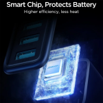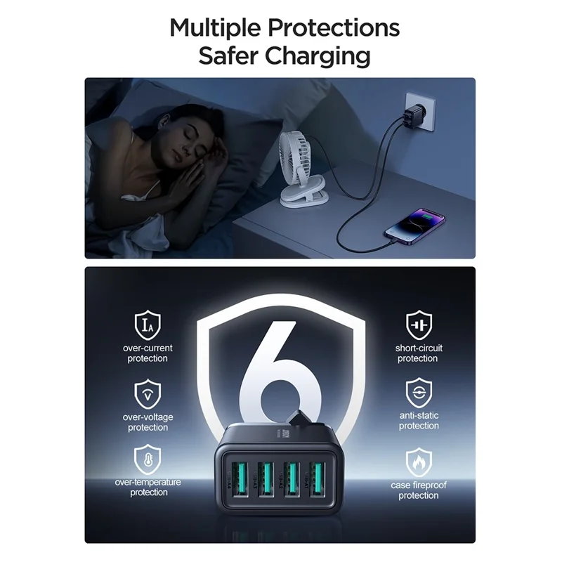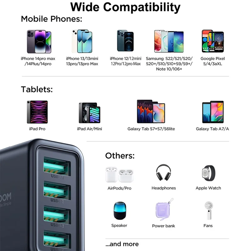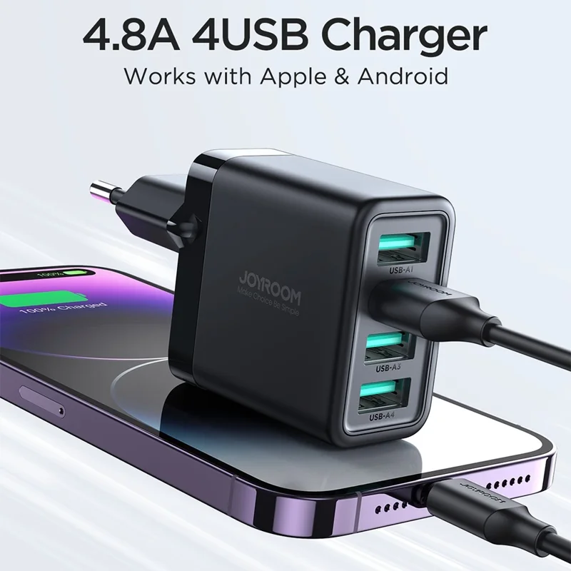 Deze compacte en krachtige JOYROOM netlader kan meerdere apparaten tegelijk van stroom voorzien.