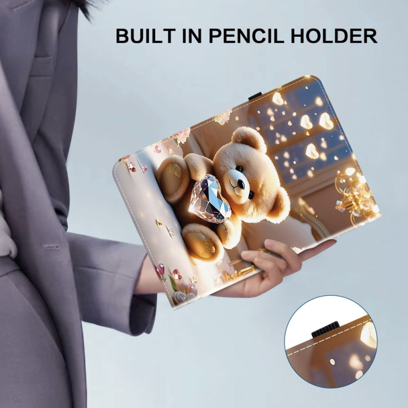 Bescherm je tablet in stijl met deze multifunctionele hoes met ruitjesbeermotief. Met een verstelbare opvouwbare standaard, geïntegreerde kaartsleuven en een veilige elastische sluiting combineert deze hoes stijl en functionaliteit.