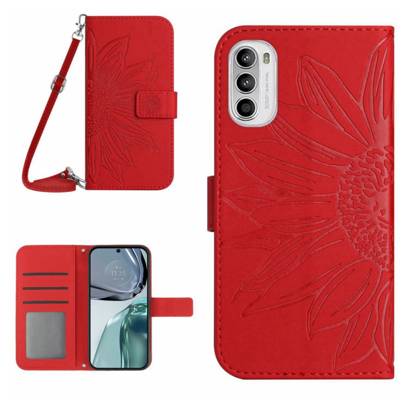 De Moto G62 5G is perfect beschermd met een Sunflower cover die wordt geleverd met een schouderriem.