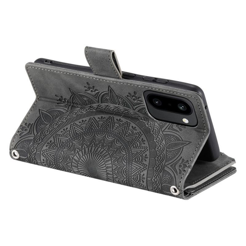 Elegante PU lederen portemonnee hoes voor OnePlus 15R 5G met verfijnd mandala motief. Voorzien van meerdere kaartsleuven, een ritsvak en een praktische handriem. Geïntegreerde standaardfunctie voor handsfree gebruik en veilige magneetsluiting.
