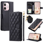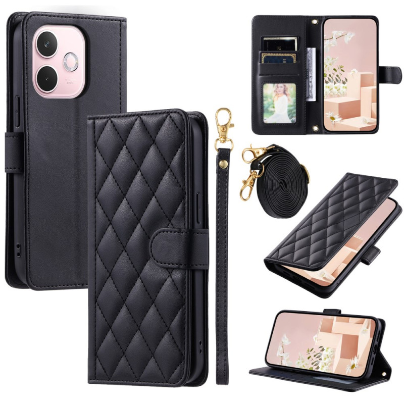 Stijlvolle portemonnee hoes met doorgestikt ruitpatroon voor Oppo A5 Pro 5G / 4G. Voorzien van kaartvakjes, veilige magnetische sluiting en standaardfunctie. Wordt geleverd met verstelbare schouderriem en handriem voor handig dragen.
