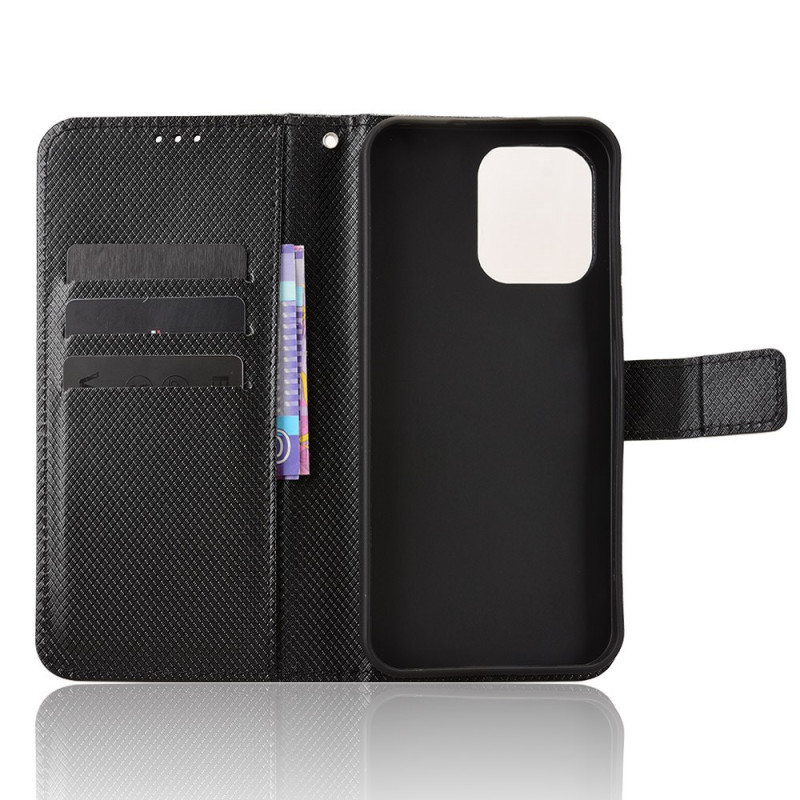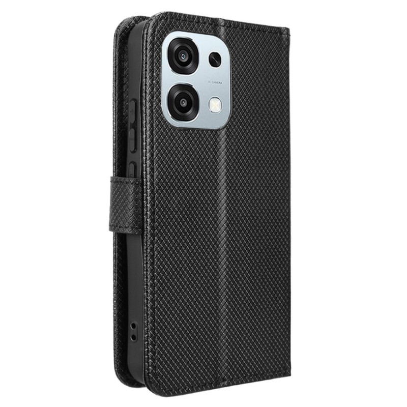 Stijlvolle portemonneehoes met diamantstructuur voor je Oppo A6 Pro 5G. Voorzien van kaartsleuven, een opvouwbare standaard en een praktische handriem. Volledige bescherming tegen stoten en krassen. Veilige magnetische sluiting voor optimaal dagelijks gebruik.