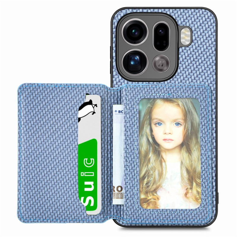 Premium hoesje voor Oppo Find X9 Pro 5G dat stijl en functionaliteit combineert. Volledige koolstofvezel textuurleren bescherming met geïntegreerde magnetische kaarthouder en anti-RFID technologie. Verstelbare standaard en compatibiliteit met magnetische autohouder.