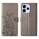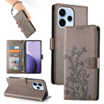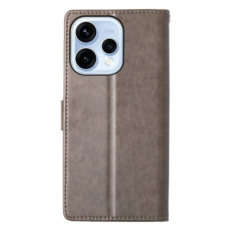 Stijlvolle portemonneehoes voor Oppo Reno 15 5G met bloemenvlindermotief in reliëf. Ontwerp van twee materialen, synthetisch leer en zacht TPU voor optimale bescherming. Inclusief opvouwbare standaard, kaartsleuven en handige handriem.