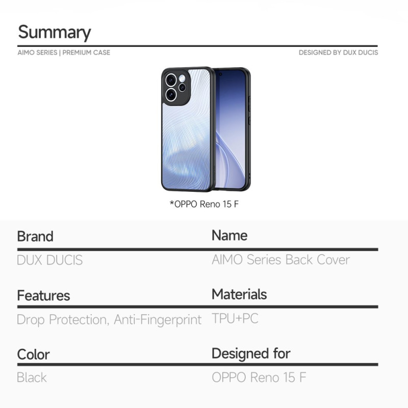 Protégez votre Oppo Reno 15 F 5G / FS 5G avec élégance grâce à la coque DUX DUCIS Aimo Series. Sa conception bicouche offre une protection robuste contre les chutes jusqu'à 1,2m (certifié SGS) tout comme les chocs du quotidien. Son design mat avec lignes fluides...