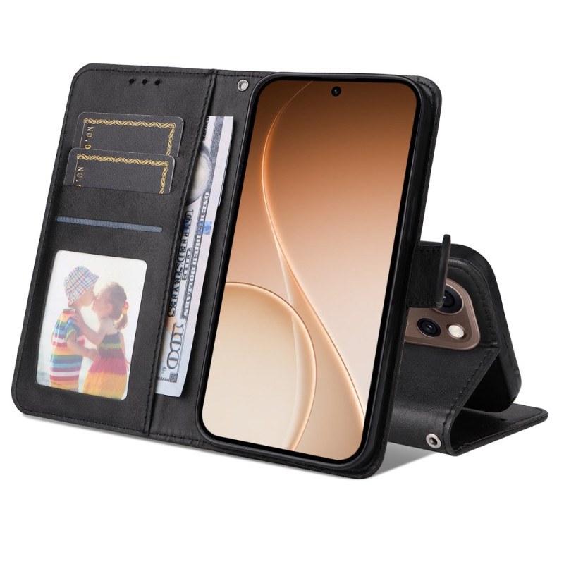 Ontdek onze stijlvolle portemonneehoes voor Oppo Reno 15 Pro 5G. Geraffineerd ontwerp met kaartsleuven, geïntegreerde standaard en veilige magnetische sluiting. Volledige 360° bescherming dankzij het robuuste TPU-hoesje en flapontwerp.