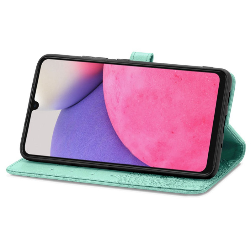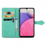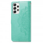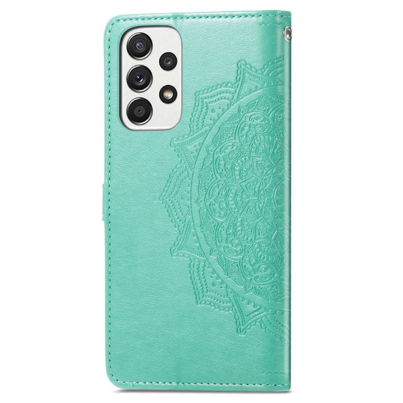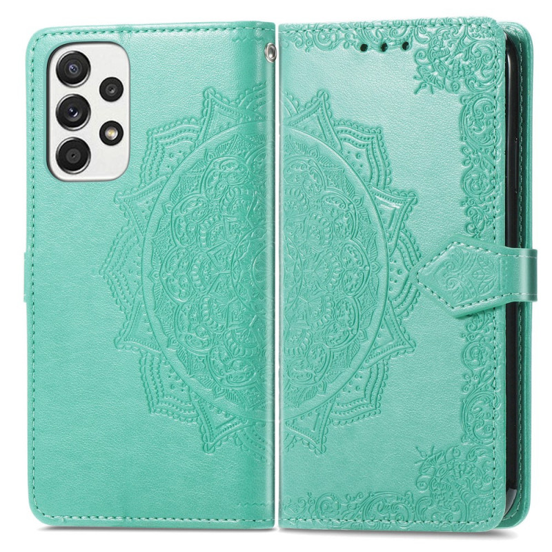 Een prachtige hoes voor de Samsung Galaxy A13, versierd met een middeleeuwse mandala, die het toestel volledig beveiligt en tegelijkertijd dienst doet als portemonnee.