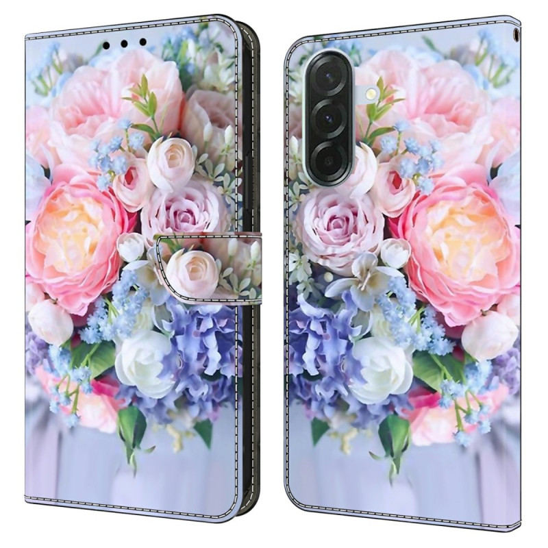 Étui portefeuille élégant avec fermoir magnétique et motif floral 3D pour Samsung Galaxy A57 5G. Comprend 2 emplacements pour cartes, 1 poche pour billets et fonction support intégrée. Protection complète avec rebord surélevé pour l'objectif.