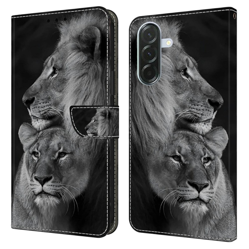 Découvrez notre étui portefeuille élégant pour Samsung Galaxy A57 5G orné d'un motif 3D couple de lions. Doté d'une fermeture magnétique sécurisée, de compartiments pour cartes et espèces, et d'une fonction support intégrée pour une expérience mains libres...