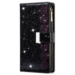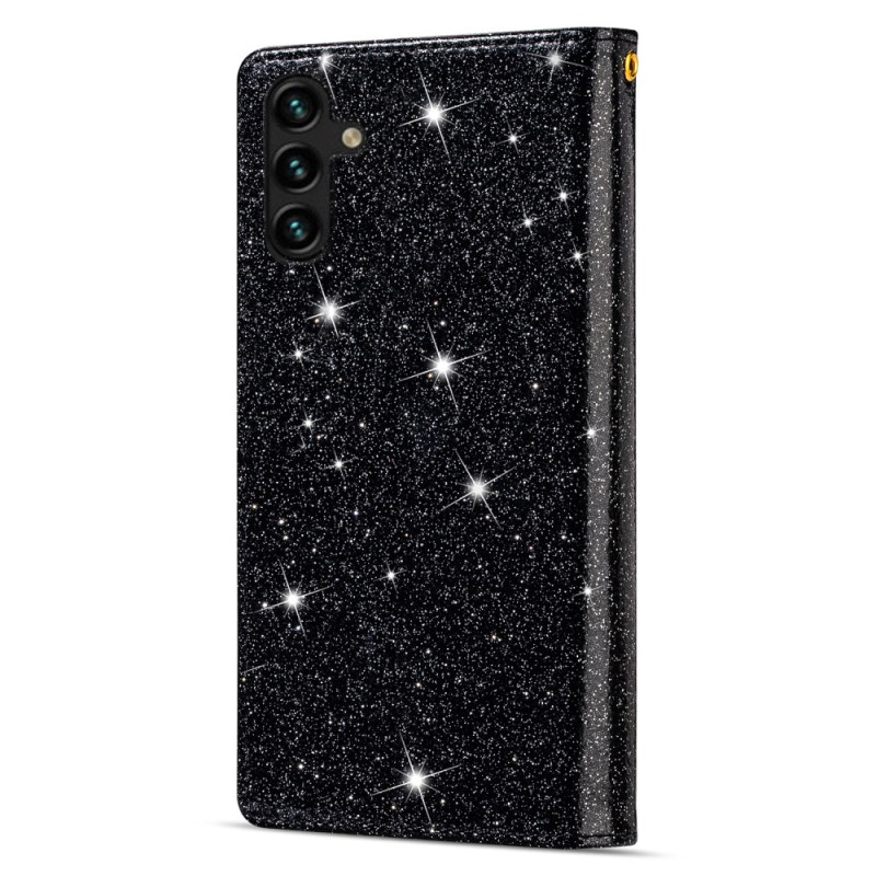 Stijlvol portemonnee hoesje voor Samsung Galaxy A57 5G met lasergegraveerd sterrenhemelontwerp en glitters. Voorzien van kaartsleuven, ritsvak en praktische handriem voor veilig dragen.