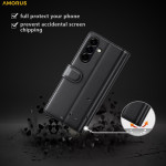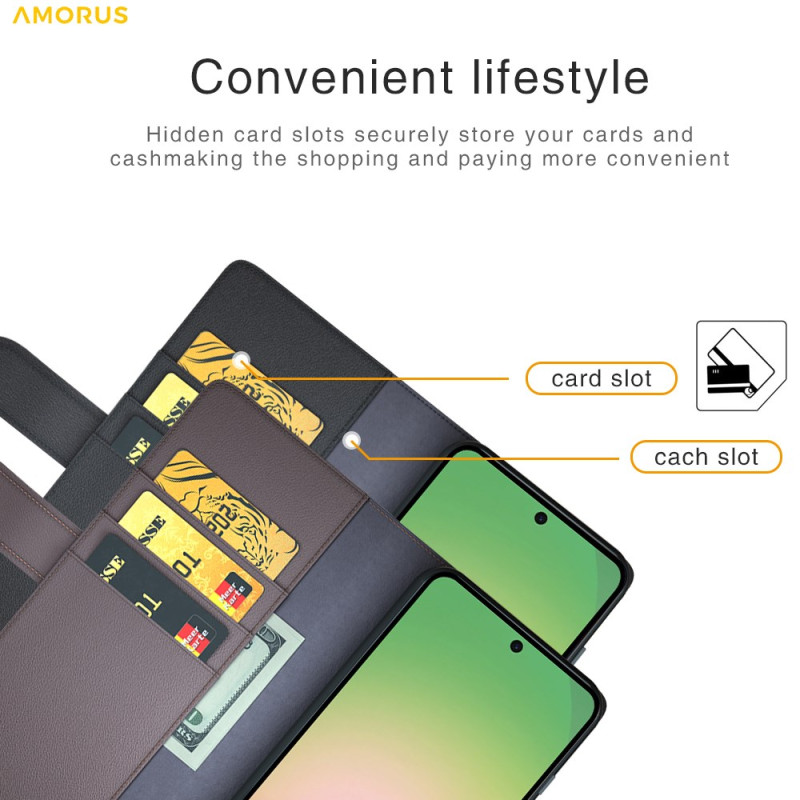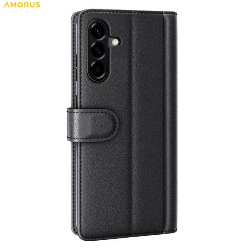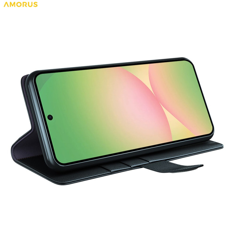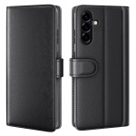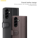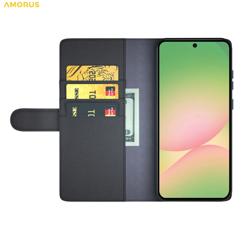 Echt lederen portemonnee hoesje voor Samsung Galaxy A57 5G. Elegant ontwerp met kalfsnerfstructuur, geïntegreerde uitklapbare standaard, 3 kaartsleuven en 1 vakje voor bankbiljetten. Volledige bescherming met veilige magnetische sluiting.