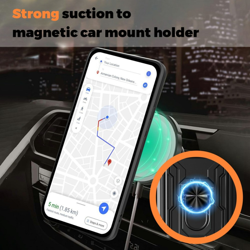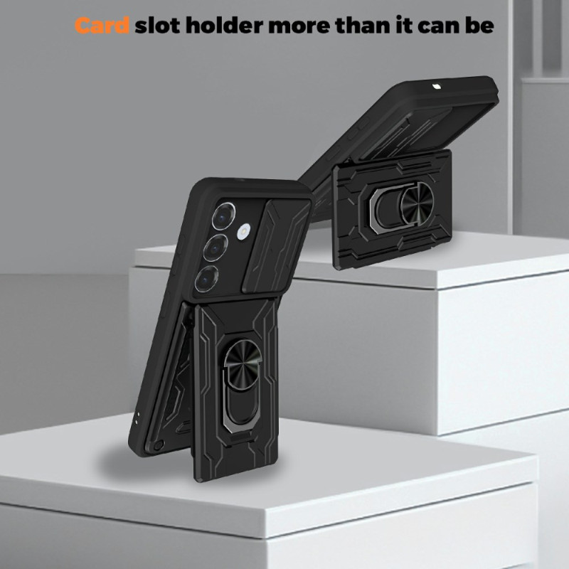 Bescherm je Samsung Galaxy A57 5G met deze multifunctionele hoes met opvouwbare metalen standaard, geïntegreerde kaarthouder en verschuifbare camerabescherming. Compatibel met magnetische autohouders.