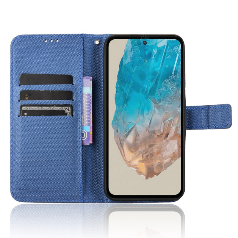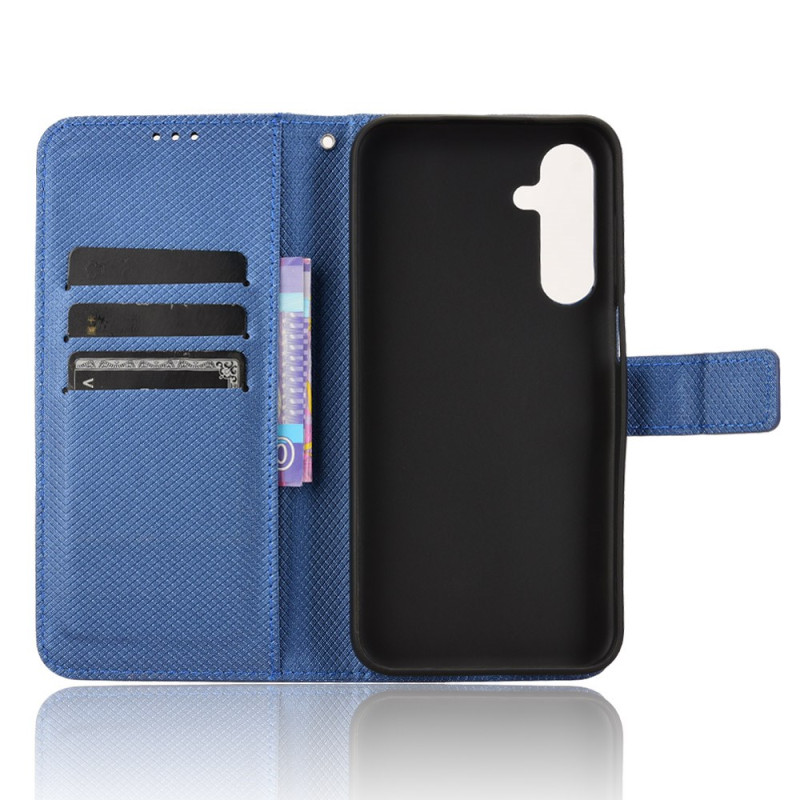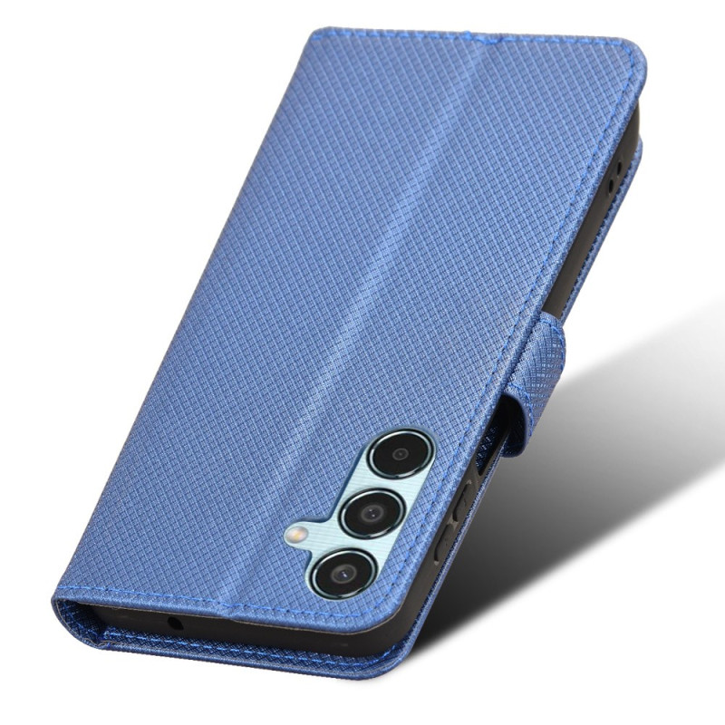 Ontdek onze elegante PU lederen hoes met diamantstructuur voor de Samsung Galaxy M35 5G. Het combineert stijl en functionaliteit en biedt volledige bescherming met kaartsleuven, een ticketvakje, een magnetische sluiting en een opvouwbare standaard.