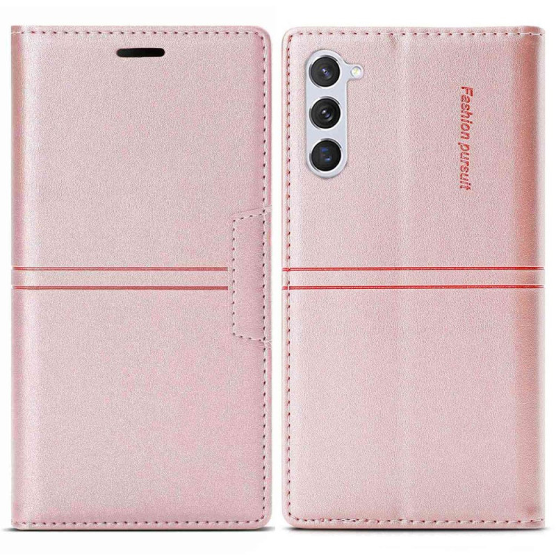 Uw Samsung Galaxy S23 5G is zeer goed beschermd met deze leren flip cover met zichtbare stiksels en magnetische sluiting.