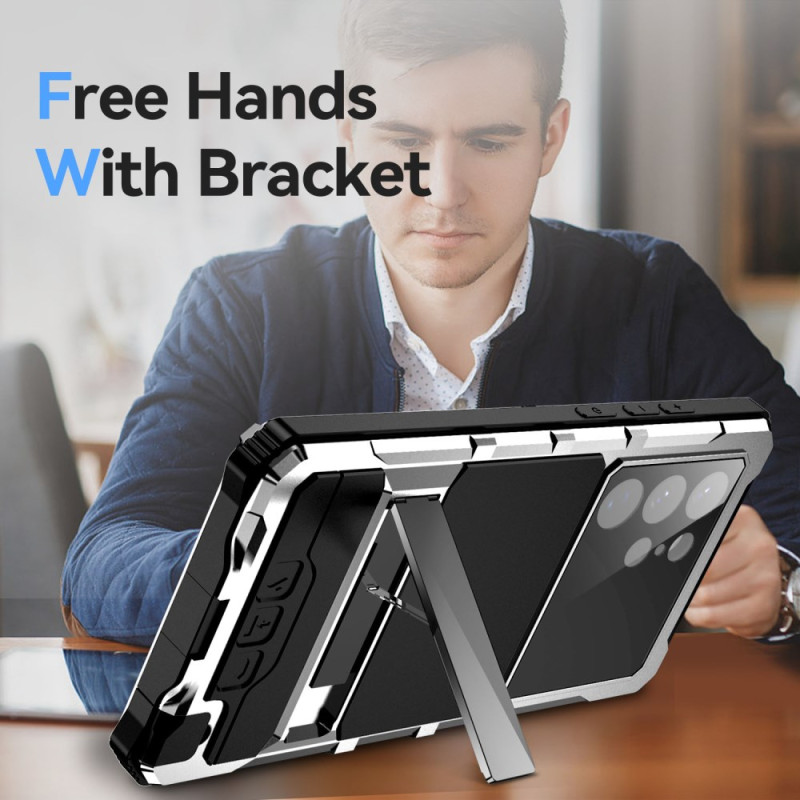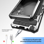 Ontdek onze robuuste hoes voor de Samsung Galaxy S23 Ultra. Met zijn duurzame constructie van kunststof, siliconen en metaal biedt hij volledige bescherming tegen vallen, water en stof.
