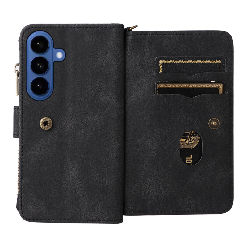 Maak van je Samsung Galaxy S26 5G een echte portemonnee met deze stijlvolle multifunctionele hoes. Met 15 kaartsleuven, een veilig vak met ritssluiting en een afneembare polsband combineert het praktisch met bescherming.