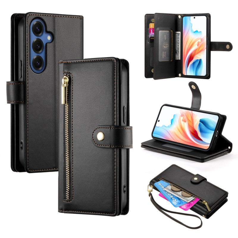 Étui portefeuille multifonction en cuir PU pour Samsung Galaxy S26. Protection intégrale avec compartiments pour cartes, monnaie et billets. Livré avec bandoulière ajustable et dragonne pour un transport mains libres. Support pliable intégré.