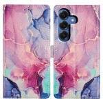 Elegant klep portemonnee hoesje met groen en roze marmerpatroon voor Samsung Galaxy S26 Plus. Alles-in-één ontwerp met 2 kaartsleuven, fotovak en ruim zijvak. Inclusief geïntegreerde standaard voor handsfree kijken en afneembare handriem.