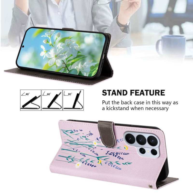 Bescherm je Samsung Galaxy S26 Ultra in stijl met dit lavendelkleurige kunstlederen portemonnee hoesje. Verfijnd ontwerp met bedrukte motieven, schokbestendige TPU schelp, verstelbare steun en afneembare handband voor praktisch dagelijks gebruik.