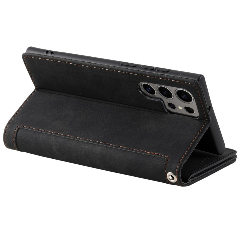 Multifunctionele PU-leren portemonnee met 9 kaartsleuven, ritsvak en handriem. Veilige magneetsluiting en handsfree functie voor comfortabel video kijken. All-round bescherming tegen alledaagse stoten en schokken.