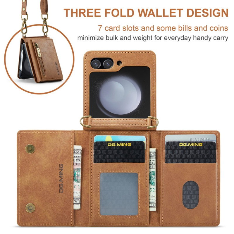 Ontdek de DG.MING M5 Series hoes voor Samsung Galaxy Z Flip, die stijl en bescherming combineert. Hij is gemaakt van duurzaam PU-leer en een stevig PC-frame en biedt handige opbergruimte voor pasjes en geld. Profiteer van de ingebouwde houderfunctie en RFID-blokkeringstechnologie voor extra veiligheid. Het functionele ontwerp heeft een magnetische sluiting en afneembare schouderriem voor maximale veelzijdigheid.