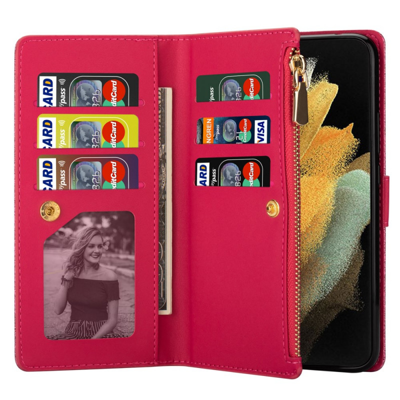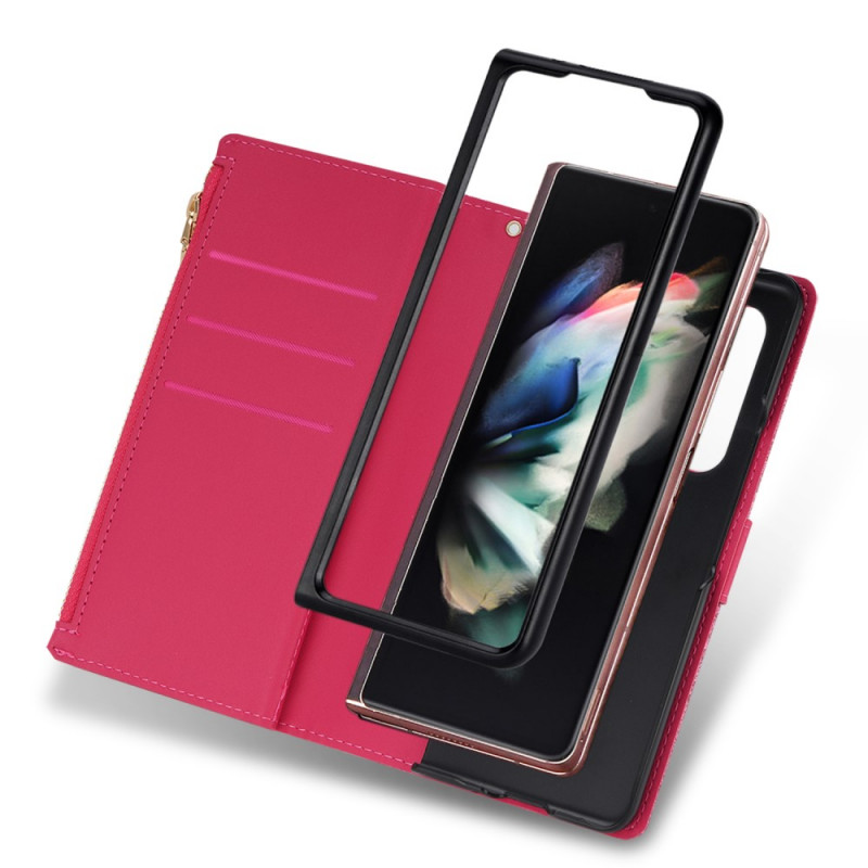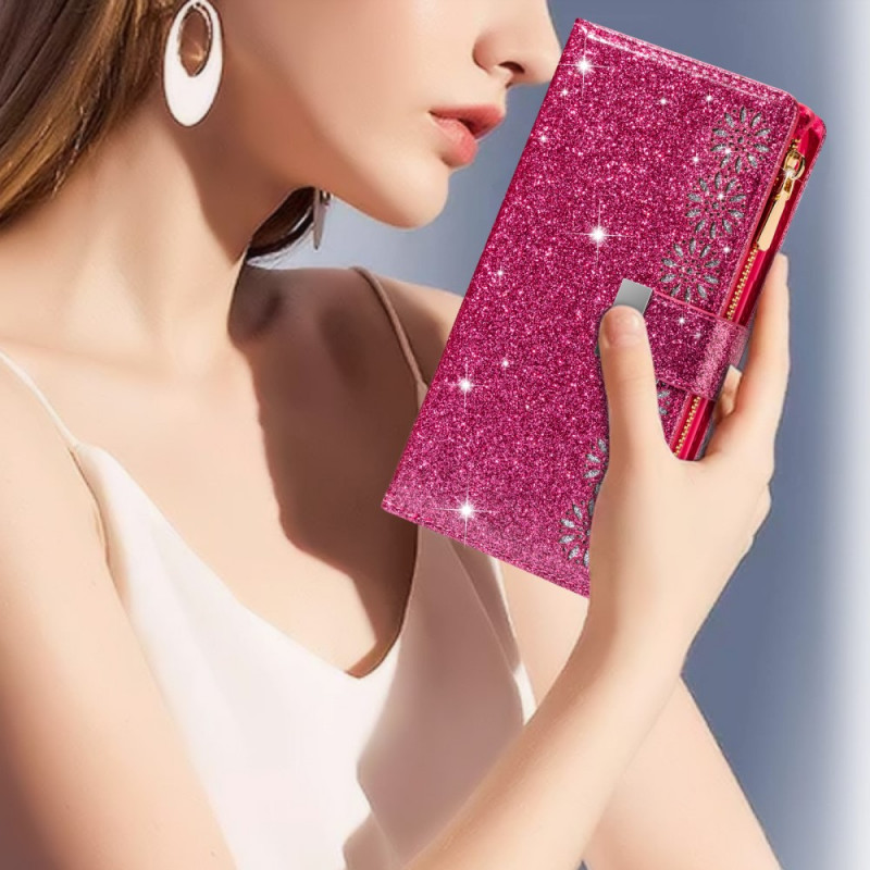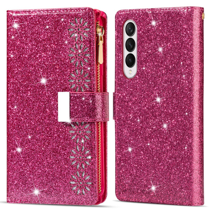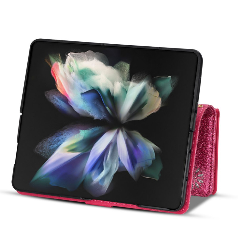 Een geweldige glitterhoes voor de Samsung Galaxy Z Fold 3 5G met meerdere kaarthouders en een vak met ritssluiting voor kleingeld of als draagtas.