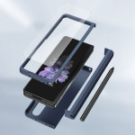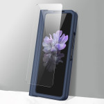 De gehele telefoon wordt beschermd door plastic, een gehard glazen scherm en een verwijderbaar scharnier.