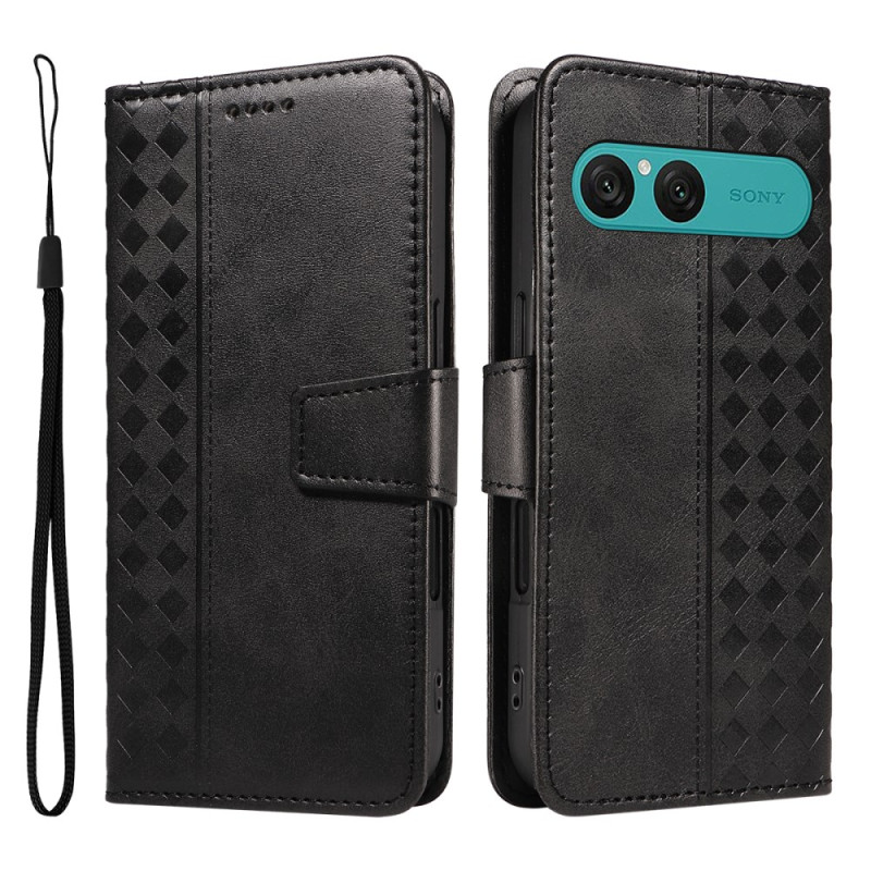 Stijlvolle PU lederen hoes met rasterpatroon voor Sony Xperia 10 VII. Meerdere functies, waaronder kaarthouder, ticketzakje, handsfree kijkstandaard en afneembare handriem. Biedt volledige bescherming dankzij de schokabsorberende TPU binnenkant.