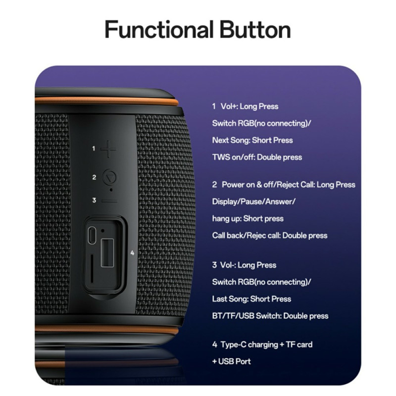 - Veelzijdige afspeelopties: Compatibel met meerdere afspeelmodi, waaronder TF-kaart, FM-radio, USB, TWS, AUX en Bluetooth voor maximale flexibiliteit.
