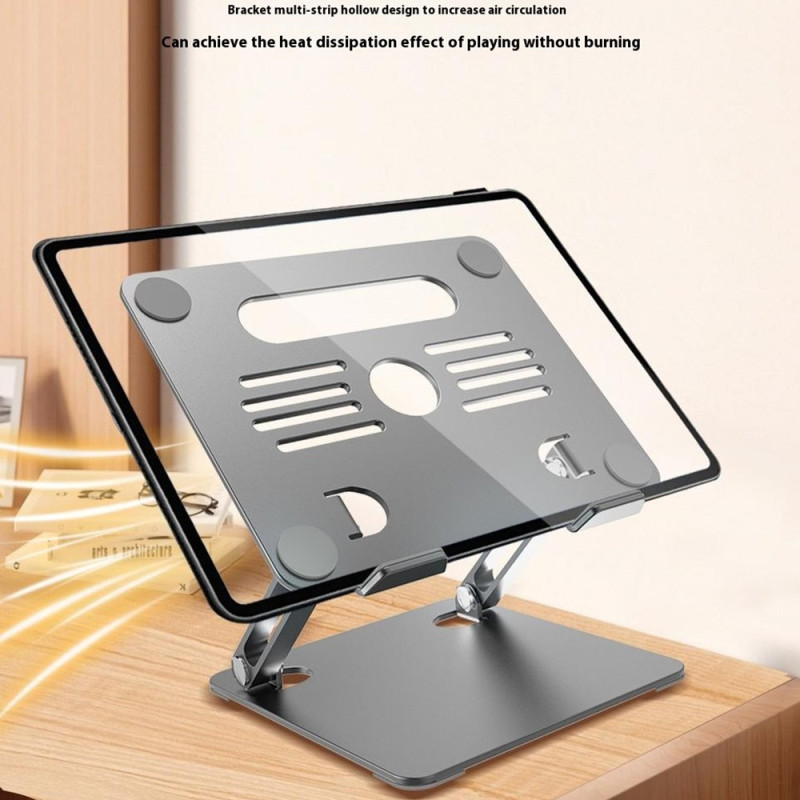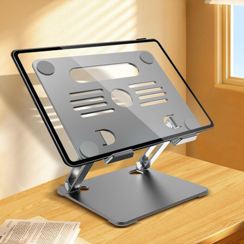 Deze laptopstandaard met geïntegreerde ventilator zorgt voor optimale koeling, zelfs bij intensief gebruik. Dankzij de traploos instelbare hoogte kun je een ergonomische en comfortabele houding aannemen, ideaal voor langdurig werk. De koolstofstalen structuur zorgt voor een uitstekende stabiliteit en kan een belasting tot 10 kg dragen. Dankzij het opvouwbare ontwerp is hij gemakkelijk mee te nemen en past hij op alle computers en tablets tot 17,3". Hij wordt gevoed door een 5V/2A voeding en het systeem met ventilatie en een geperforeerd oppervlak verbetert de warmteafvoer aanzienlijk.