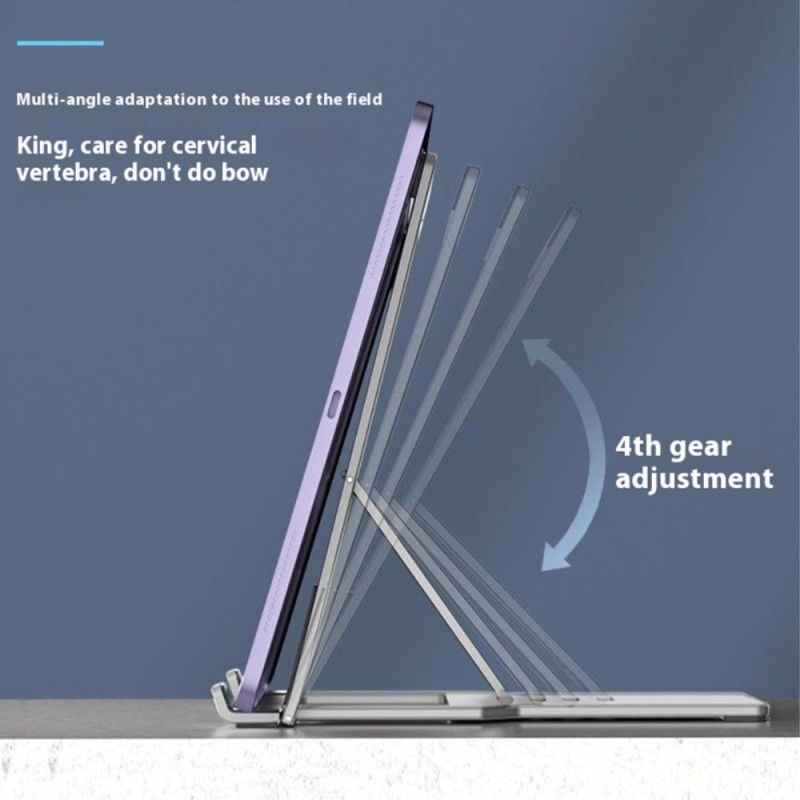 De inklapbare standaard H12PLUS biedt een elegante, stabiele en veelzijdige oplossing voor tablets, schermen en draagbare monitoren van 5 tot 16 inch. Met zijn 4 instelbare hoogteniveaus, variërend van ongeveer 146 tot 165 mm, biedt hij een comfortabele kijkhoek om te werken, video's te bekijken of te tekenen. De aluminium legering structuur is gecombineerd met anti-slip siliconen voetjes om een uitstekende stabiliteit te garanderen en je apparatuur te beschermen. Hij is ultradun, licht en volledig opvouwbaar, dus gemakkelijk te vervoeren en helpt ook de luchtcirculatie onder je apparaten te verbeteren.