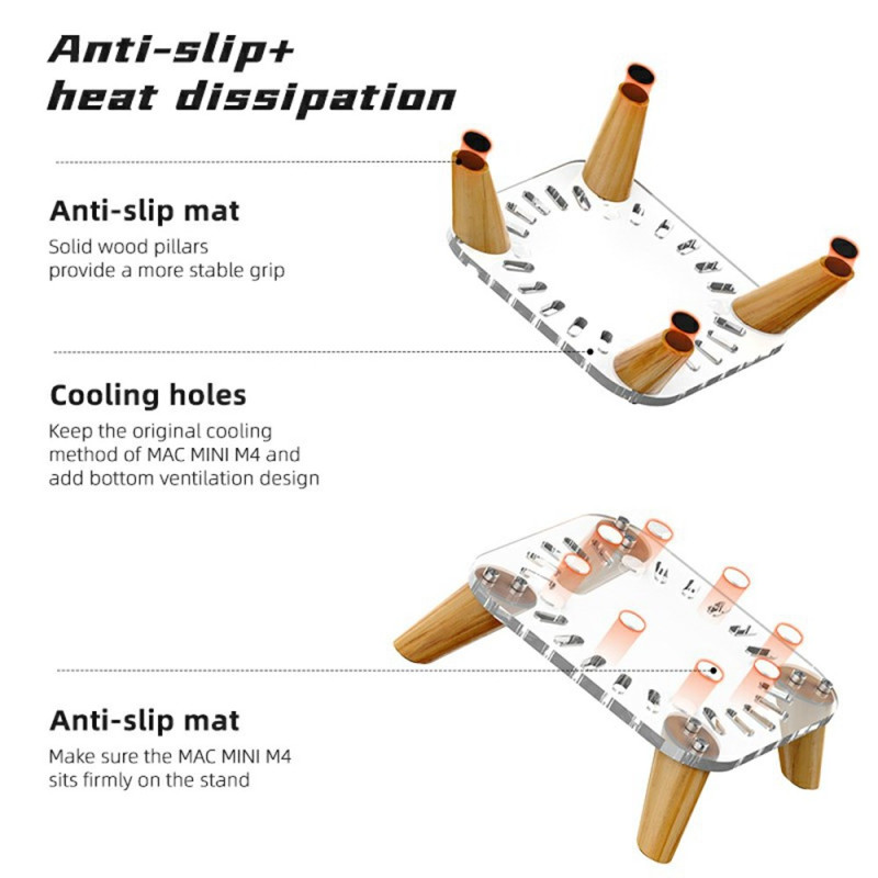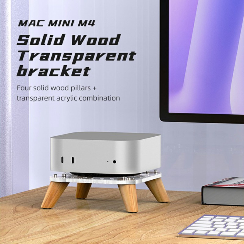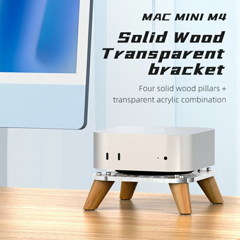 De WoodStand verticale standaard voor Mac Mini M4 en M4 Pro biedt de perfecte combinatie van esthetiek en functionaliteit. De standaard is exclusief ontworpen voor het 2024-model en zet het apparaat 40 mm hoger om de luchtcirculatie te verbeteren en de koeling te optimaliseren. De structuur, een combinatie van vier massief houten poten en een 5 mm acrylaatplaat, garandeert stabiliteit en elegantie. Zowel in de basis als in de poten zijn antislipkussentjes geïntegreerd voor een perfecte pasvorm. Elk stuk is zorgvuldig met de hand gepolijst voor een eersteklas afwerking, ideaal voor een modern kantoor.