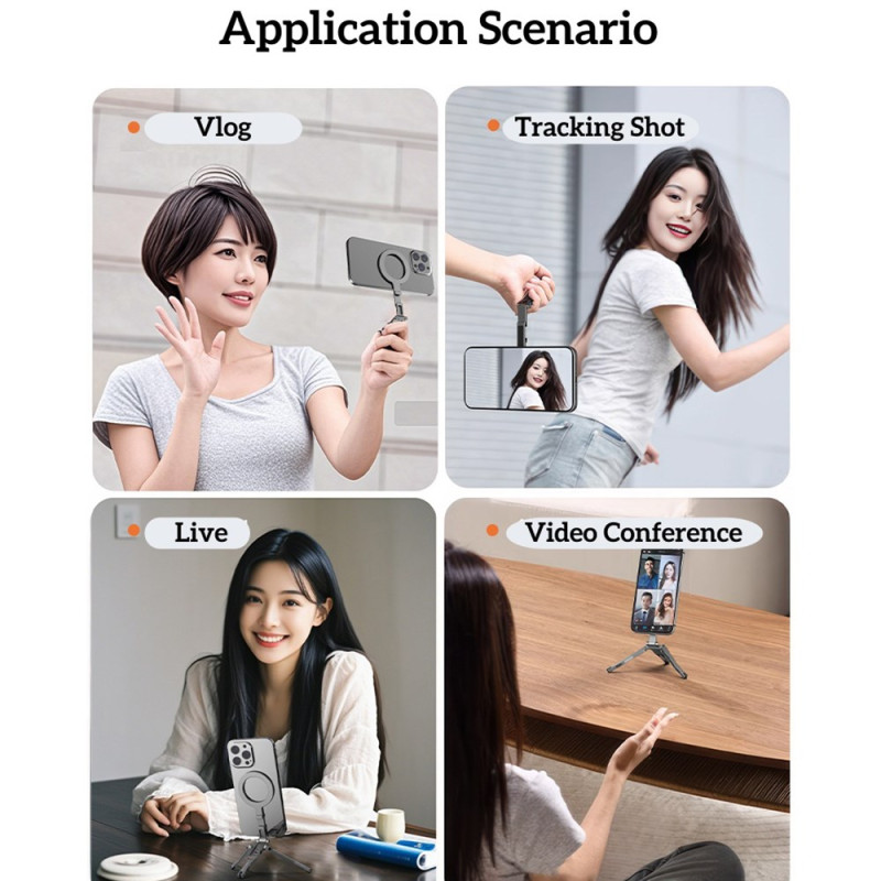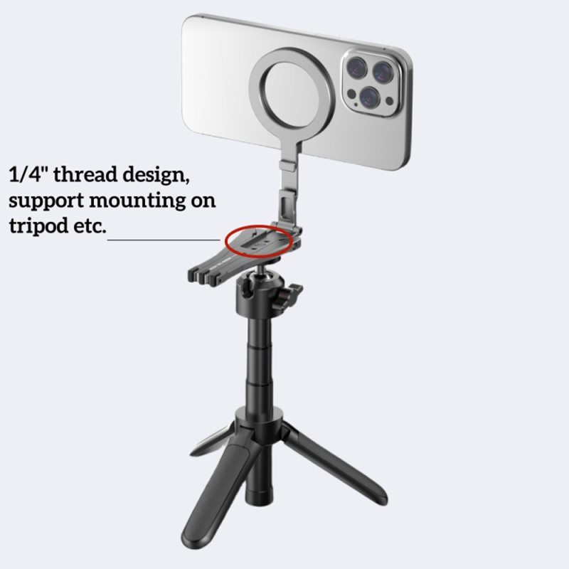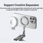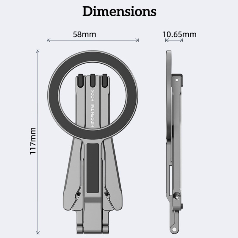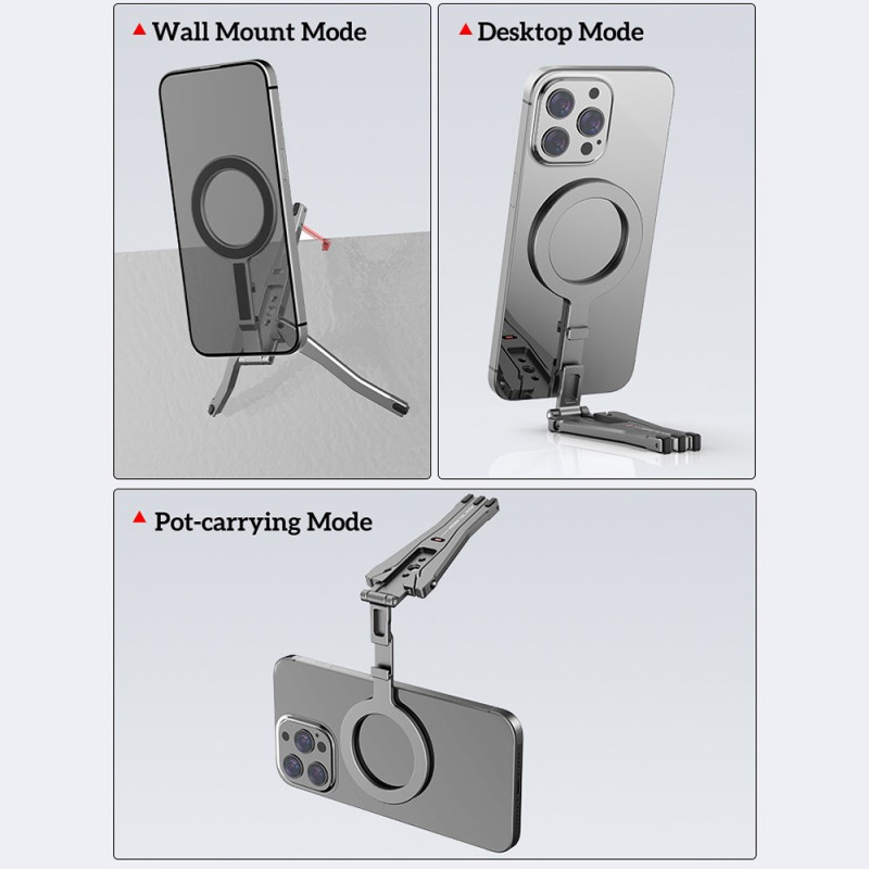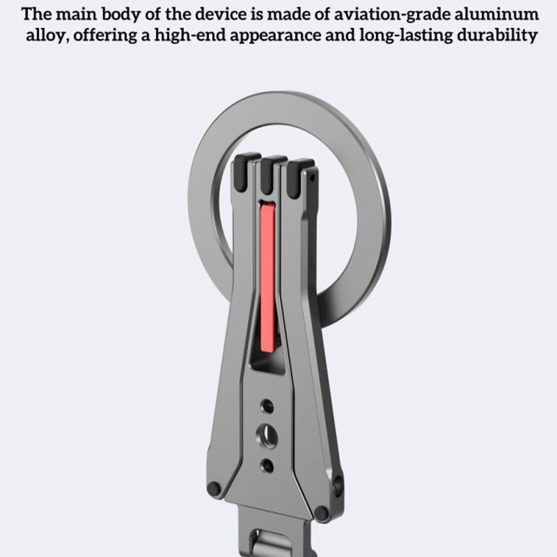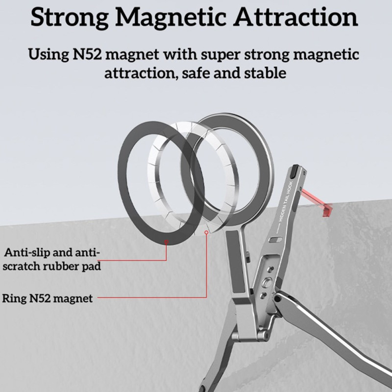 Deze magnetische houder is een opvouwbaar statief dat is ontworpen voor een veelzijdige en ultrapraktische handsfree ervaring. Compatibel met iPhones 12 tot 16 dankzij directe magnetische hechting of MagSafe hoesjes , maar ook geschikt voor andere smartphones via de meegeleverde magnetische ring. Gemaakt van een sterke, lichtgewicht aluminiumlegering en voorzien van krachtige aluminium-ijzer-borium magneten voor een stevige grip. Compact opgevouwen (117 × 58 × 10,65 mm) en met een gewicht van slechts 60 g, kan het worden gebruikt als statief, bureaustandaard of kantelstandaard, afhankelijk van je behoeften.