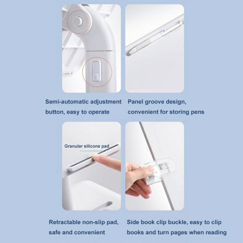 Deze leesstandaard voor kinderen is de ideale ergonomische oplossing voor het bevorderen van een correcte houding tijdens het studeren of lezen. Dankzij het verdikte frame biedt hij een uitstekende stabiliteit zonder te wiebelen. Dankzij het halfautomatische verstelsysteem kun je de hoek snel en moeiteloos aanpassen, terwijl de telescopische hoogte zich aanpast aan kinderen van verschillende leeftijden. De kantelplaat kan worden omgevormd tot een plat oppervlak voor gebruik als klein bureau. Lichtgewicht en eenvoudig te monteren, inclusief een penhoudergroef en anti-slip zijclips om boeken en benodigdheden veilig op hun plaats te houden.