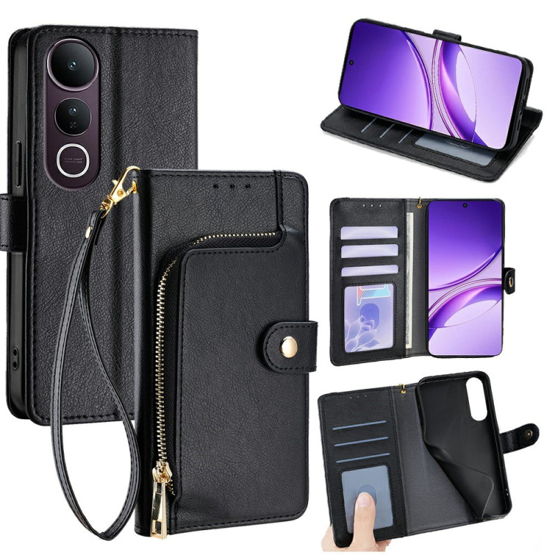 Multifunctionele portemonnee hoes voor Vivo V50 Lite 5G met elegante olie-was textuur. Voorzien van kaartsleuven, extern ritsvak, opvouwbare standaard en veilige magnetische sluiting. Volledige bescherming tegen stoten en vallen.