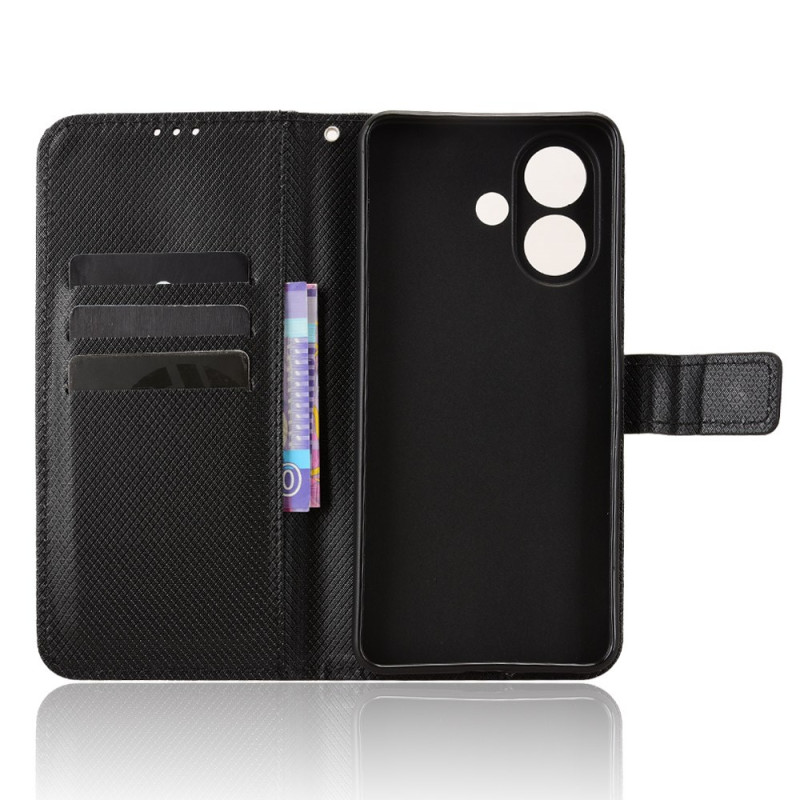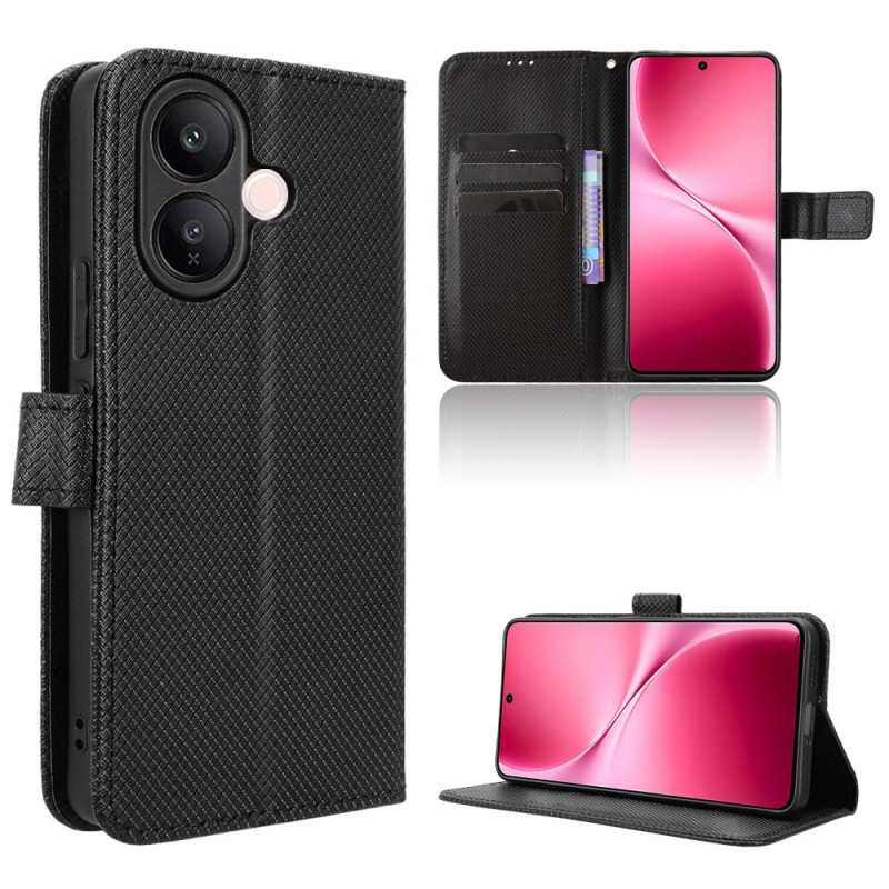 Ontdek deze elegante portemonneehoes met diamantstructuur voor je vivo V60 Lite 5G. Met kaartvakjes, een geldvakje en een praktische polsband combineert hij stijl en functionaliteit om je telefoon elke dag te beschermen.
