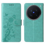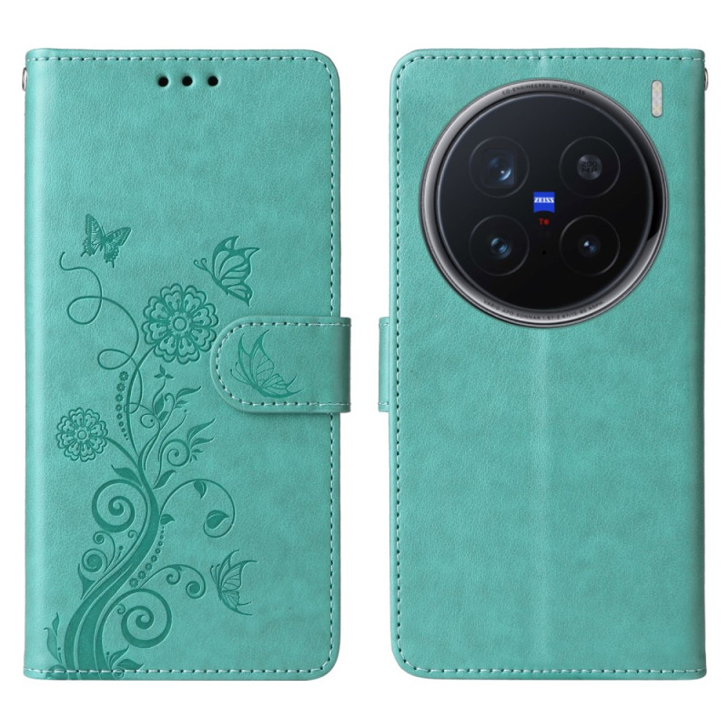 Elegante kunstlederen hoes voor de Vivo X200 Pro 5G met bloemen- en vlinderprint. Voorzien van een geïntegreerde standaard, kaartsleuven en portemonneevak. Volledige bescherming met praktische handriem voor gemakkelijk dragen.